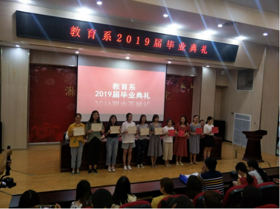 典礼开场,全体成员起立,奏唱国歌。张志华致辞发言,张志华向教育系2019届全体毕业生致以热烈的祝贺,就如何适应社会,结合自己的亲身经历给毕业生们提出了三点建议:一是在今后的生活中遇到困难要有勇气,攻坚克难,砥砺奋进;二是学会不断拓宽视野,认真学习,努力提升和完善自己;三是对待工作要兢兢业业,从小事做起,脚踏实地,一步一个脚印,以求真务实的态度对待工作,才能做有所成。张志华还对毕业生们表达了殷切期望,希望全体毕业生能够牢记“修德立身 精技立业”校训,向优秀校友们看齐,在工作岗位上发光发热,成为城院的优秀传人。 2019届优秀毕业生代表王德安以“感恩母校”为主题上台发言;2017级在校生代表何姝璟上台为学长学姐们送上珍贵的祝福;毕业班班主任代表胡芝玮教师为2019届全体毕业生送上了临别赠言,表达了对全体毕业生的美好祝愿。