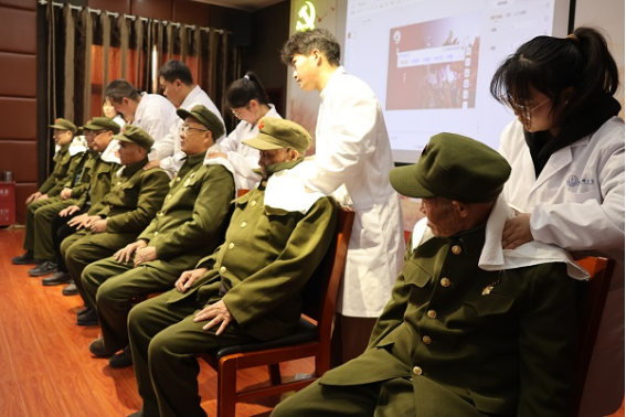 随后,医学院副院长徐旭为退役老兵开展了一场中医健康知识讲座,同时,医学专业师生也为退役老人现场进行了一场一对一的健康义诊服务,面对面地向老人们传授健康生活方式、普及健康知识,让老兵们感受到来自“家门口”的健康医疗服务,切实增强退役老兵的荣誉感、获得感和幸福感。