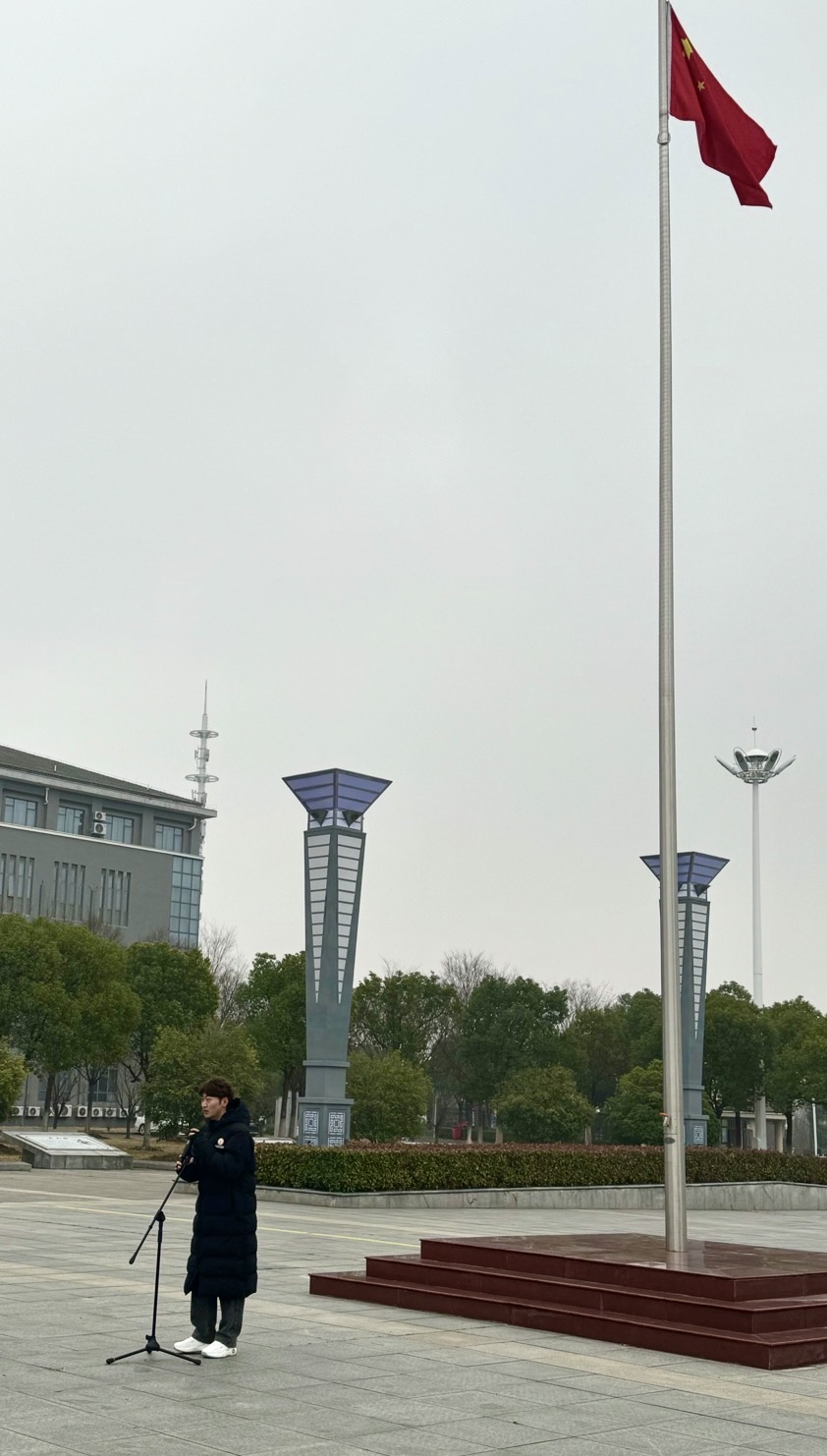 国旗护卫队迈着整齐有力的步伐,护卫着五星红旗走向升旗台。全体师生肃立,齐声高唱《义勇军进行曲》。随着激昂的旋律,五星红旗在晨光中冉冉升起,迎风飘扬,象征着中华民族的团结奋进和伟大复兴。这一刻,爱国之情在每一位师生心中油然而生。