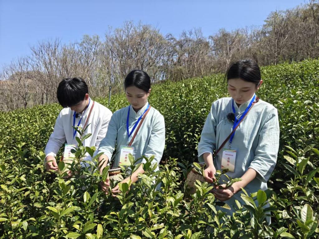 在专业导演组的悉心指导下,同学们身着传统采茶服饰,身挎竹篓,迅速融入采茶人的角色。茶场老板现场教学,为同学们讲解“一芽一叶”的采摘技巧。同学们认真学习,手指在西涧春雪茶树的枝头灵动飞舞。为了捕捉到最佳镜头,全方位展现标准的采茶动作,同学们不厌其烦,反复调整采摘姿势,从多个角度配合拍摄 。参与拍摄的同学感慨道:“亲手采摘茶叶让我体会到茶农的辛劳,更感受到每一片茶叶背后精益求精的工匠精神。”