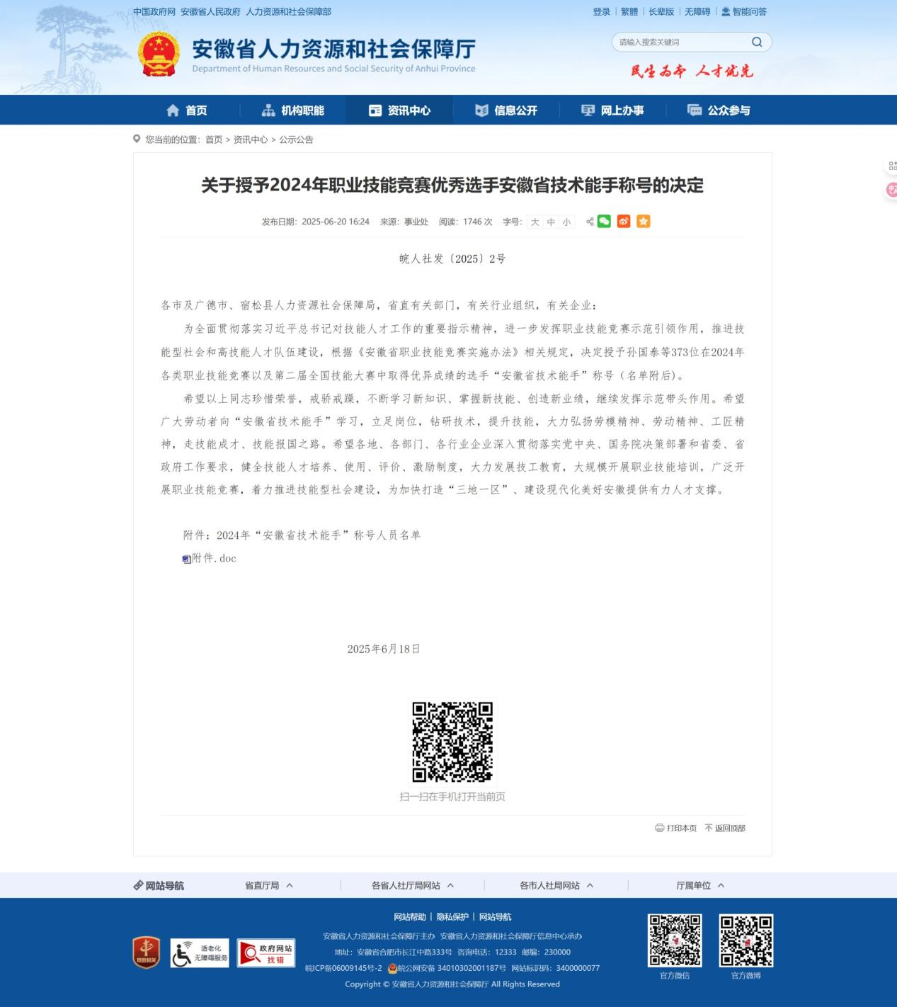 近日,安徽省人力资源和社会保障厅公布《关于授予2024年职业技能竞赛优秀选手安徽省技术能手称号的决定》,教育学院张凯老师凭借在2024年度安徽省职业技能竞赛中的优异表现,被授予“安徽省技术能手”称号。