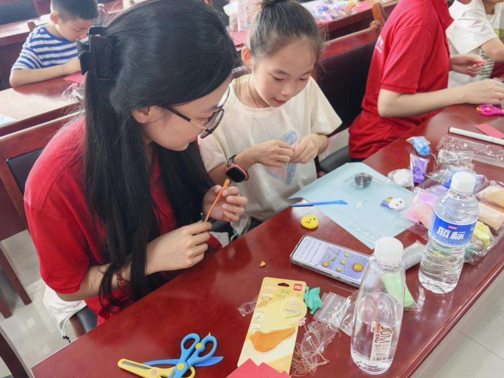入党积极分子刘映彤化身“红色美育导师”,带领孩子们将党史元素融入手工创作。小朋友们在志愿者指导下,把红纸剪成八路军战士冲锋形象,用粘土塑出“80周年胜利火炬”。共青团员樊云璐设计的“抗战英雄剪纸图谱”,让孩子们在指尖流转中感悟“红纸载忠魂”的深意。“姐姐教我剪的小红军真神气!”少先队员朵朵骄傲地举起作品。