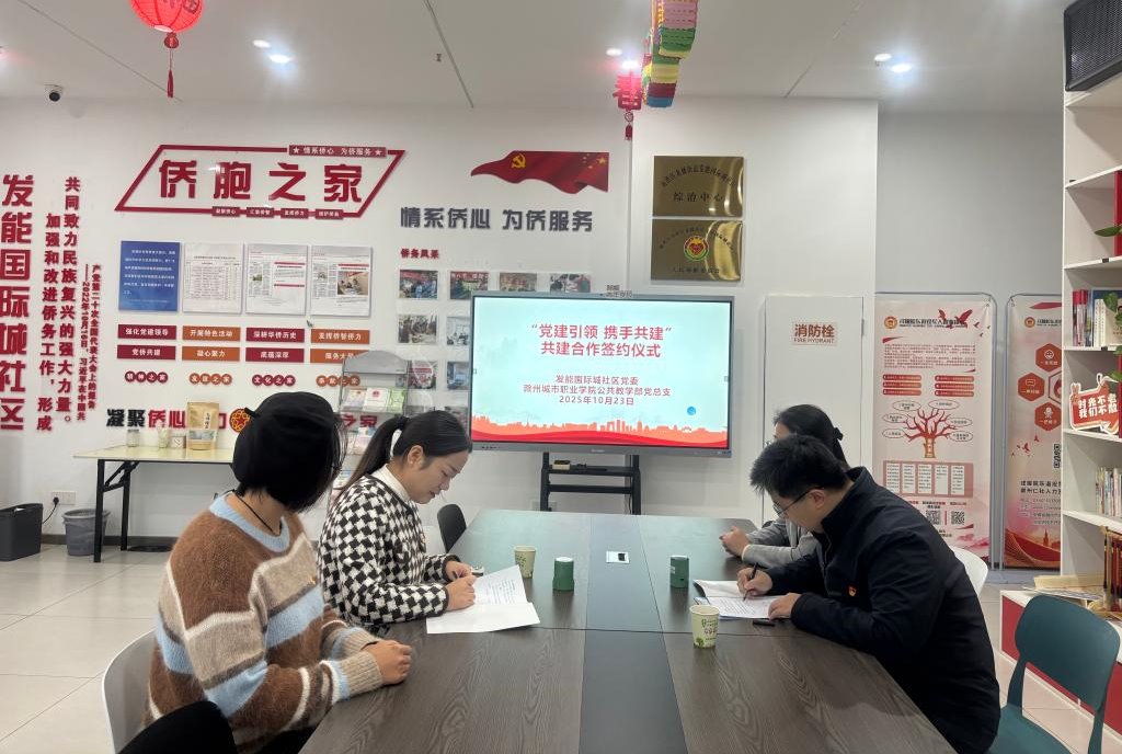 为深入贯彻落实新时代党的建设总要求,创新基层党建工作载体,有效整合区域党建资源,切实提升基层党组织组织力,10月23日上午,公共教学部党总支与发能国际城社区党委联建协议在社区服务中心顺利签订。此举是落实学校《“1+2”校政企党组织联建工作实施方案》精神的具体实践,通过与发能国际城社区建立党组织联建关系,旨在探索基层党建工作的新模式、新路径。