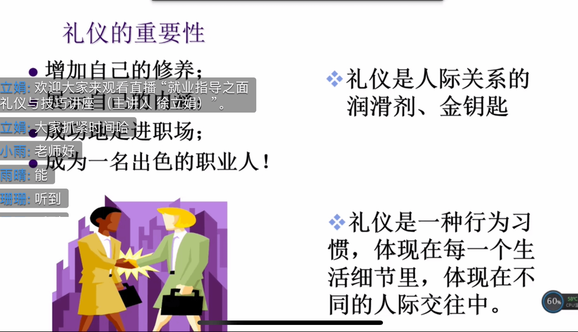 俗话说,“好的开始是成功的一半”,面试着装与礼仪关系着面试评委对求职者的第一印象,虽然重要,但是往往被大家所忽视。讲座伊始,徐立娟老师围绕教师编制考试中的着装、妆容和礼仪进行了详细讲解。徐立娟老师指出,在面试中保持良好的礼仪是对他人的尊重,能让对方感觉到舒适与亲切,更能给自己增色不少。她介绍了面试中的穿着要求,包括服装、饰品的选择,整体的色彩搭配等,指导学生规避面试中着装的雷区,强调了站姿挺拔、保持微笑、适当淡妆是一个人精气神的重要体现,更能给人一种自信的感觉。徐立娟老师在讲解的过程中还注重与线上同学们的互动,让同学们受益匪浅。