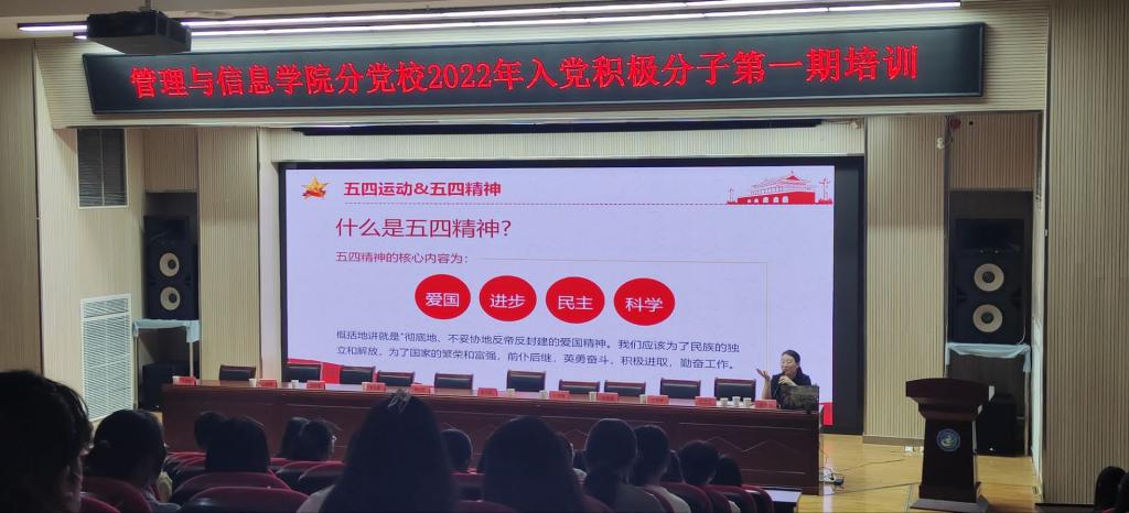5月4日晚,管理与信息学院分党校举行2022年入党积极分子第一期培训,培训由院党总支青年委员杨静怡主讲《学习“五四”精神,争做优秀青年》,管理与信息学院全体在校入党积极分子参加。