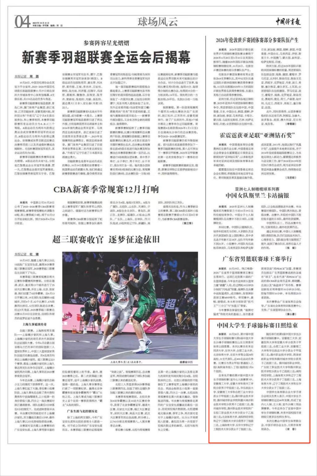 第三十七届全国大学生手球锦标赛暨第五届沙滩手球锦标赛于10月12日至10月20日在山东日照举行,共有来自同济大学、北京体育大学、上海体育大学等全国24所高校的31支代表队、近400名运动员和教练员参赛。比赛中,学校手球队团结协作,展现出良好的技战术水平和拼搏精神取得了优异的成绩。在女子乙组比赛中,女队分别荣获手球锦标赛和沙滩手球锦标赛冠军,男队获得男子乙组七人制比赛亚军。