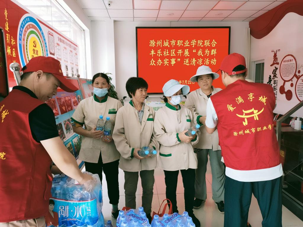 在包保社区,何洋等一支部党员同保洁人员亲切交谈,大力宣传防暑降温常识和高温应对措施,提醒大家在完成工作的前提下,合理安排工作时间,尽量避开高温时段,确保身体健康安全。保洁和其他一线人员感谢学院的清凉慰问,纷纷表示,虽烈日炎炎,但会始终坚守岗位,恪尽职守,积极投身社区环境建设,为滁州城市的文明建设和丰乐社区的和谐发展贡献更多力量。(文/图:刘亮 秦海娇)