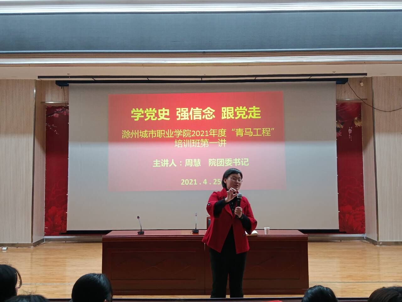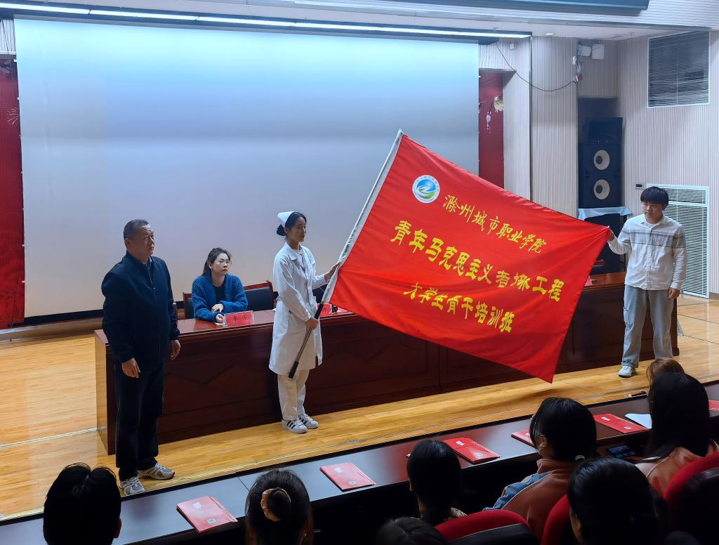 为进一步引领青年学生骨干深入学习贯彻习近平新时代中国特色社会主义思想和党的十九大精神,加强当代青年大学生“学党史、强信念、跟党走”党史学习教育,培养一批德智体美劳全面发展的社会主义建设者和接班人。4月25日下午,学院在四楼报告厅举办“学党史、强信念、跟党走”学习教育暨2021年“青马工程”培训班开班仪式。党委委员、副院长施向阳为开班仪式致辞并授旗,团委书记、定远县池河镇党委副书记周慧,各系团总支书记,2021年“青马工程”全体学员及全院团支部书记,仪式由团委副书记陈婷婷主持。