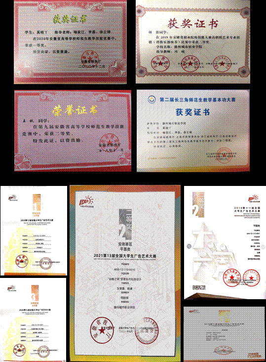 (五)以竞赛为抓手,提升师生的能力。积极参加国家、省和市级比赛,师生多人次获奖。如刘晓玲等七位教师获得安徽省高职院校教师教学能力比赛一等奖、三等奖等。音乐专业学生奚晓丫、王秋、胡笛、杨妙妹等获得安徽省高等学校师范生教学能力比赛一、二、三等奖等。艺术设计专业学生李婉杰、王敬鹤,刘大豪等同学在多届全国大学生广告设计大赛中屡获佳绩,共获得国家级一、二等奖3项,省级一、二、三等奖19项