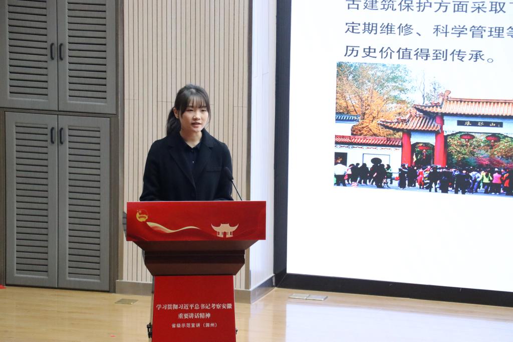 随后,六位宣讲员分别围绕《共绘徽风皖韵 唱响青年之声》《文旅融合新征程 滁州青年话担当》《文旅助力乡村振兴的小岗故事》《领航汽车“智”造 见证安徽速度》《从中国传统文化中汲取事业前进的智慧》《中华传统文化与新时代青年的双向奔赴》等主题开展宣讲,宣讲内容贴近实际、重点突出,让参加人员对学习贯彻总书记考察安徽重要讲话精神有了更全面的认识、更细致的理解、更深刻的把握。
