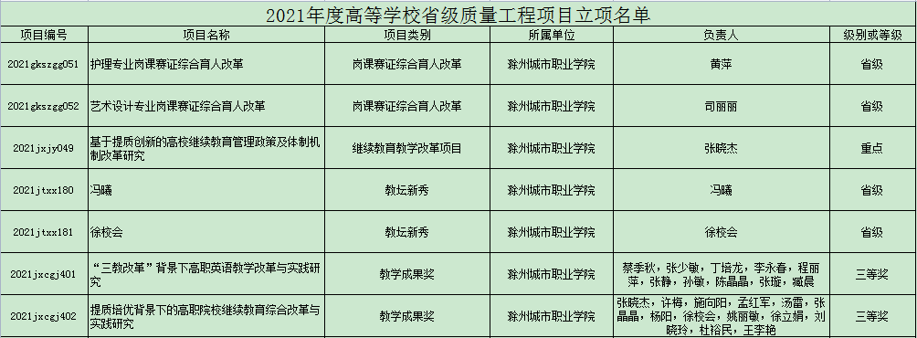近日,《安徽省教育厅关于公布2021年高等学校省级质量工程项目名单的通知》发布,继续教育学院副院长、副教授张晓杰主持申报的教学成果《提质培优背景下的高职院校继续教育综合改革与实践研究》获安徽省教学成果奖三等奖,获奖成员包括党委委员、校领导、教授施向阳,继续教育学院院长、副教授许梅等。此外,张晓杰主持的《基于提质创新的高校继续教育管理政策及体制机制改革研究》获批立项为安徽省继续教育教学改革重点项目。