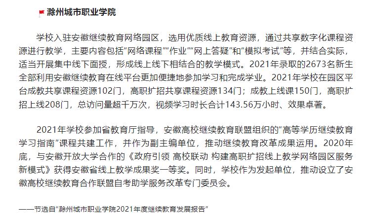 安徽继续教育网络园区园区《2022年第13期 总第36期简报:从高校2021年度继续教育发展报告看教学模式改革》节选了我校2021年度继续教育发展报告中的特色做法,并通过园区公众号向全省师生推送,以共飨改革成果。