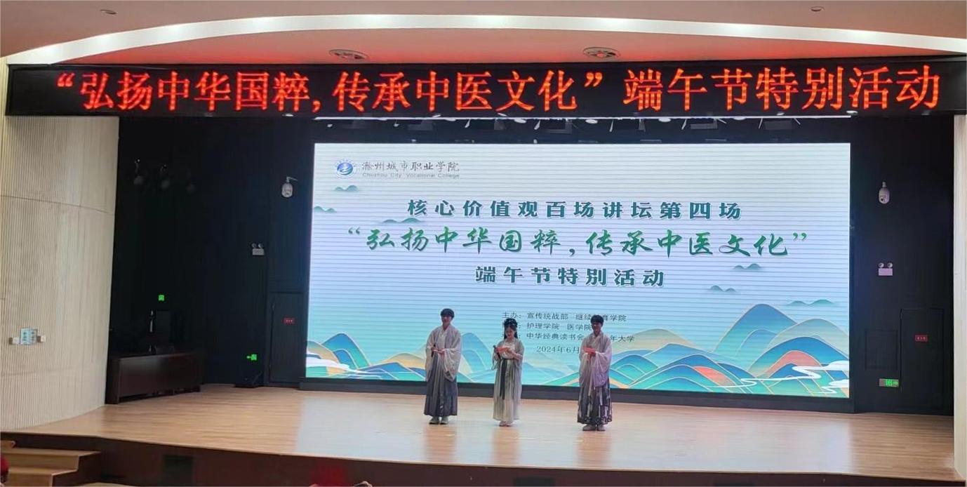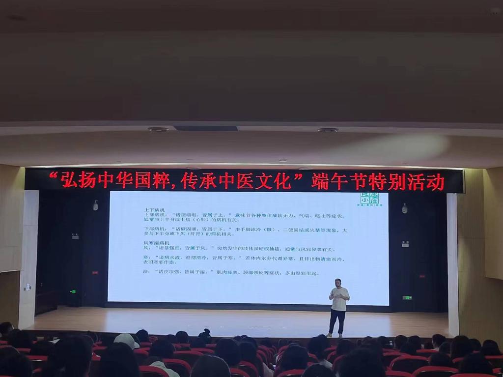 “一年一端午,一岁一安康”,为进一步弘扬社会主义核心价值观,用中华优秀传统文化中蕴涵的道德和智慧,提升当代大学生的精神境界,厚植文化自信,6月5日下午,在端午节即将来临之际,由校宣传统战部、继续教育学院主办,护理学院、医学院协办,中华经典读书会和校老年大学承办的核心价值观百场讲坛第四场“弘扬中华国粹,传承中医文化”端午节特别活动在管理与信息学院报告厅拉开帷幕,校党委副书记、校长汪上,校党委委员、副校长吴慧珍,医学院副院长徐旭,继续教育学院副院长孟红军,南京师范大学圆梦基金项目导师、六代中医世家传承人李志野,校老年大学学员、滁州心理学会及学生代表300多人参加活动。