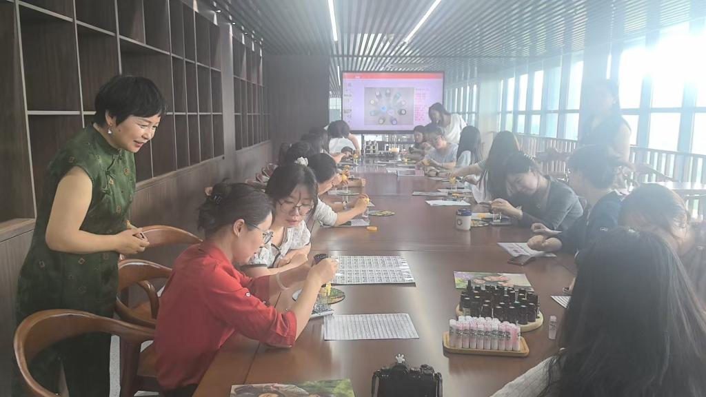 理论知识的浸润后,活动进入沉浸式体验环节。在顾老师轻柔的引导语和舒缓的背景音乐中,教职工们闭目凝神,通过科学的嗅吸方法,让精选的植物精油分子随呼吸缓缓沁入心脾。这一刻,忙碌的身心在精油的安抚下逐渐松弛,工作的疲惫与压力仿佛在芬芳中被温柔化解。现场一片宁静,唯有悠远香气与平和呼吸交织,参与者们纷纷表示体验到了久违的深层放松与内在安宁。