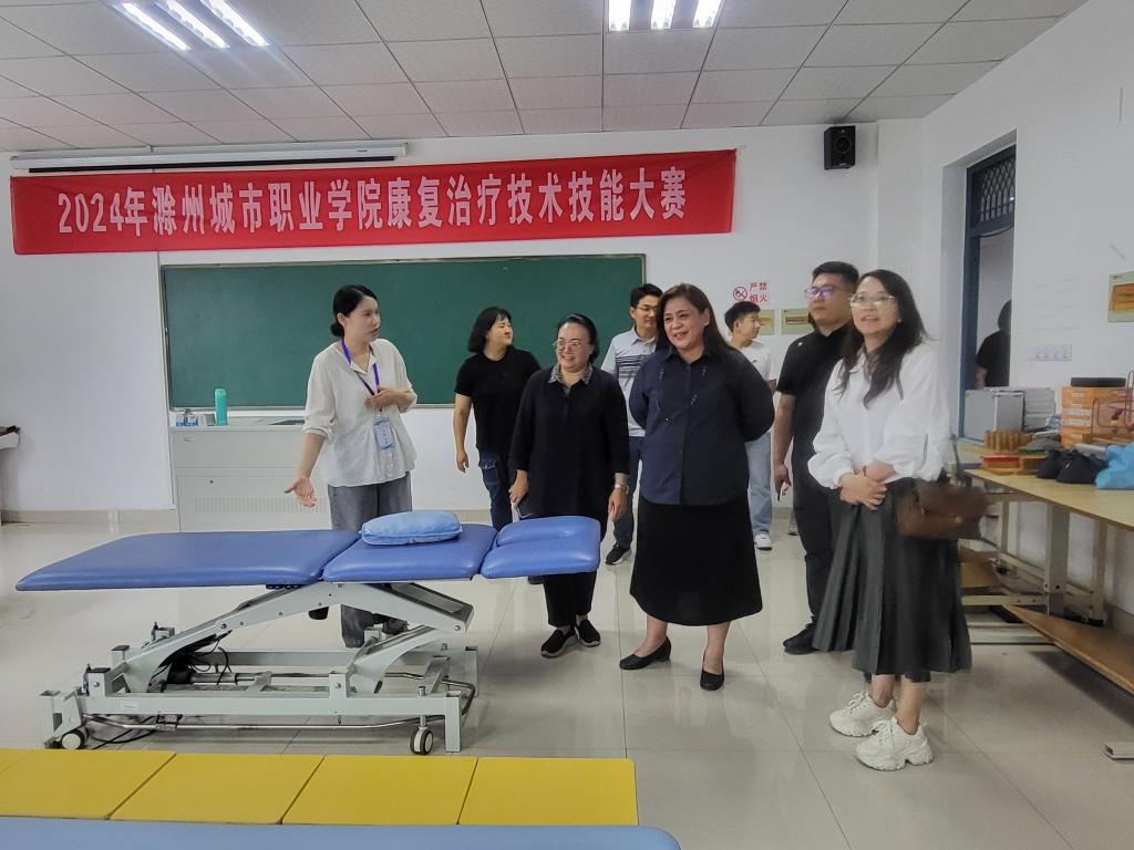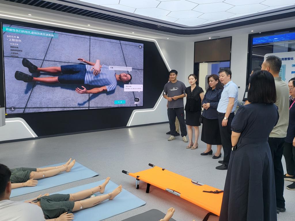 随后,代表团一行到达护理学院参观了新建成的生命健康虚拟仿真实训中心,中心内高度沉浸式的虚拟仿真教学系统,为护理及健康专业学生提供了安全、高效的实践平台,其先进理念与技术应用给来宾留下了深刻印象。在医学院,代表团参观了中医康复实训室,观摩了传统中医康复技术在现代教学环境中的应用,了解了针灸、推拿等特色项目的教学实践,对源远流长的中医智慧及其在当代康复领域的价值表现出浓厚兴趣。