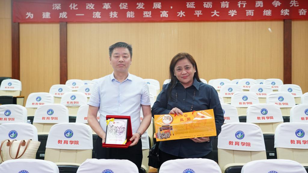 代表团一行首先前往教育学院,精巧绝伦的非物质文化遗产剪纸艺术深深吸引了来宾目光,展现了中国传统文化的深厚底蕴。在智慧托育实训室,代表团观摩了融合先进理念与技术的现代化托育教学场景,欣赏了热情洋溢的国家级非物质文化遗产凤阳花鼓表演,感受了独特的地方艺术魅力。表演结束后,双方校长互赠礼物留念,我校特别赠送了融合地方文化特色的艺术珍品——绘有精美凤阳凤画的凤阳花鼓,象征着吉祥与友谊。