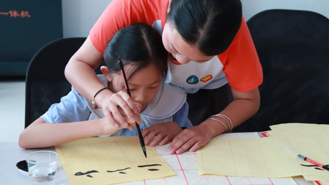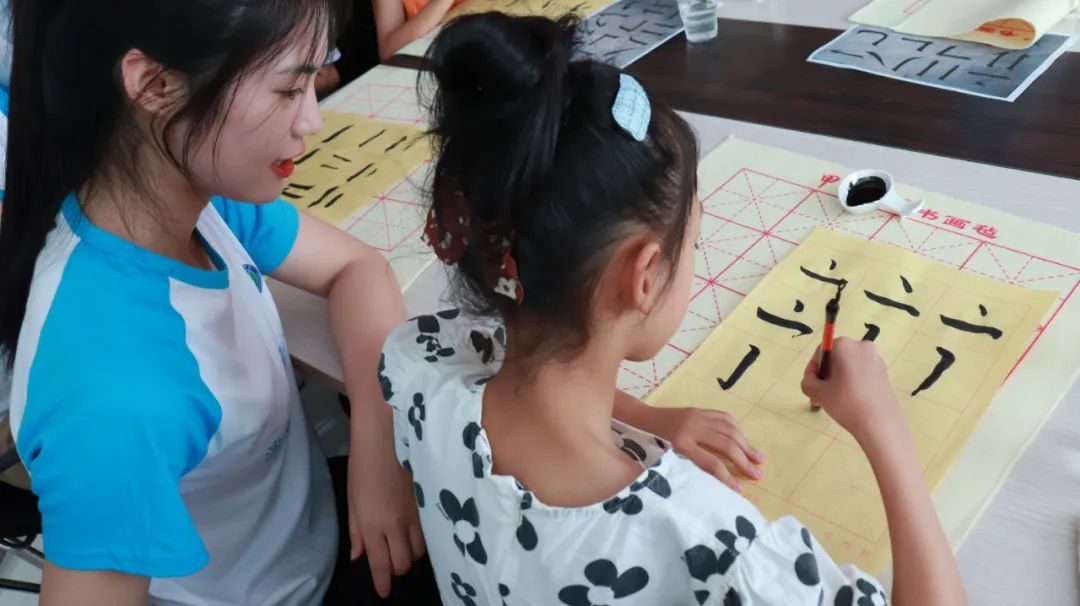 了解了书法的基本的知识后,为了进一步加深对于书法的了解,志愿者们通过让小朋友下笔实践写字,感受书法的魅力,享受书法独有的风情。
