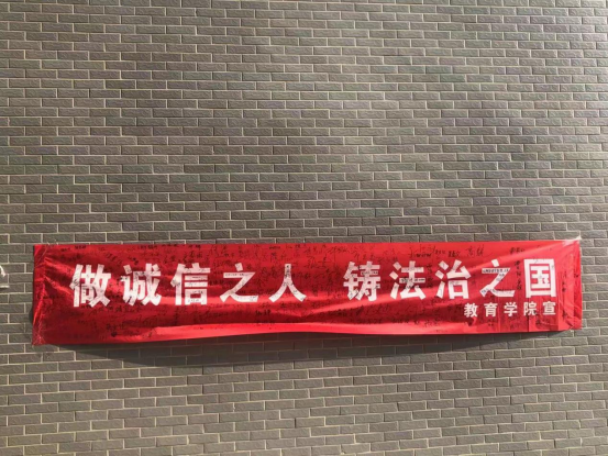 下午四点半,教育学院工作人员拉起了“诚信为本,立德修身”的红色条幅,吸引了众多同学的目光。此时正当艳阳高照,但这也丝毫没有阻挡同学们参与活动的热情。同学们纷纷在条幅上签名,表明自己履行承诺的决心。在活动过程中,工作人员积极宣传“守信于行、诚信至上”的活动主题,在广大同学中间营造出了“人人知诚信,人人讲诚信”的良好教育氛围。