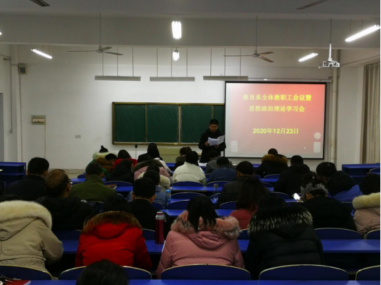 12月23日下午,教育系在C1南1103召开了全体教职工会议暨思想政治理论学习会。系党总支书记钱庆兵,系主任、党总支副书记高国柱,系党总支副书记徐立娟及全体教职工参会。会议由系书记钱庆兵主持。