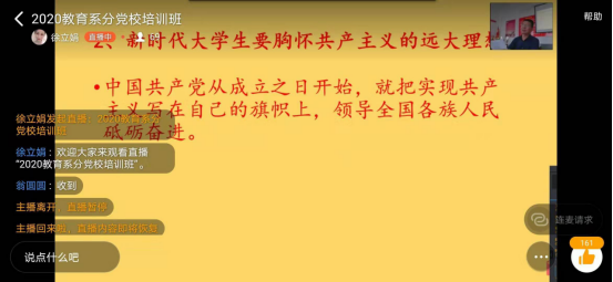 2020年6月8日下午4时40分,教育系分党校在C1南楼411会议室举办了2020年第一期培训班开班仪式暨第一讲。本次开班仪式采用线上、线下相结合的方式进行。系党总支书记钱庆兵,系党总支副书记徐立娟,系党总支委员、教工支部委员、学生支部委员成员,班主任李丹老师及本期师生学员参加了开班仪式。开班仪式由系党总支副书记徐立娟主持。