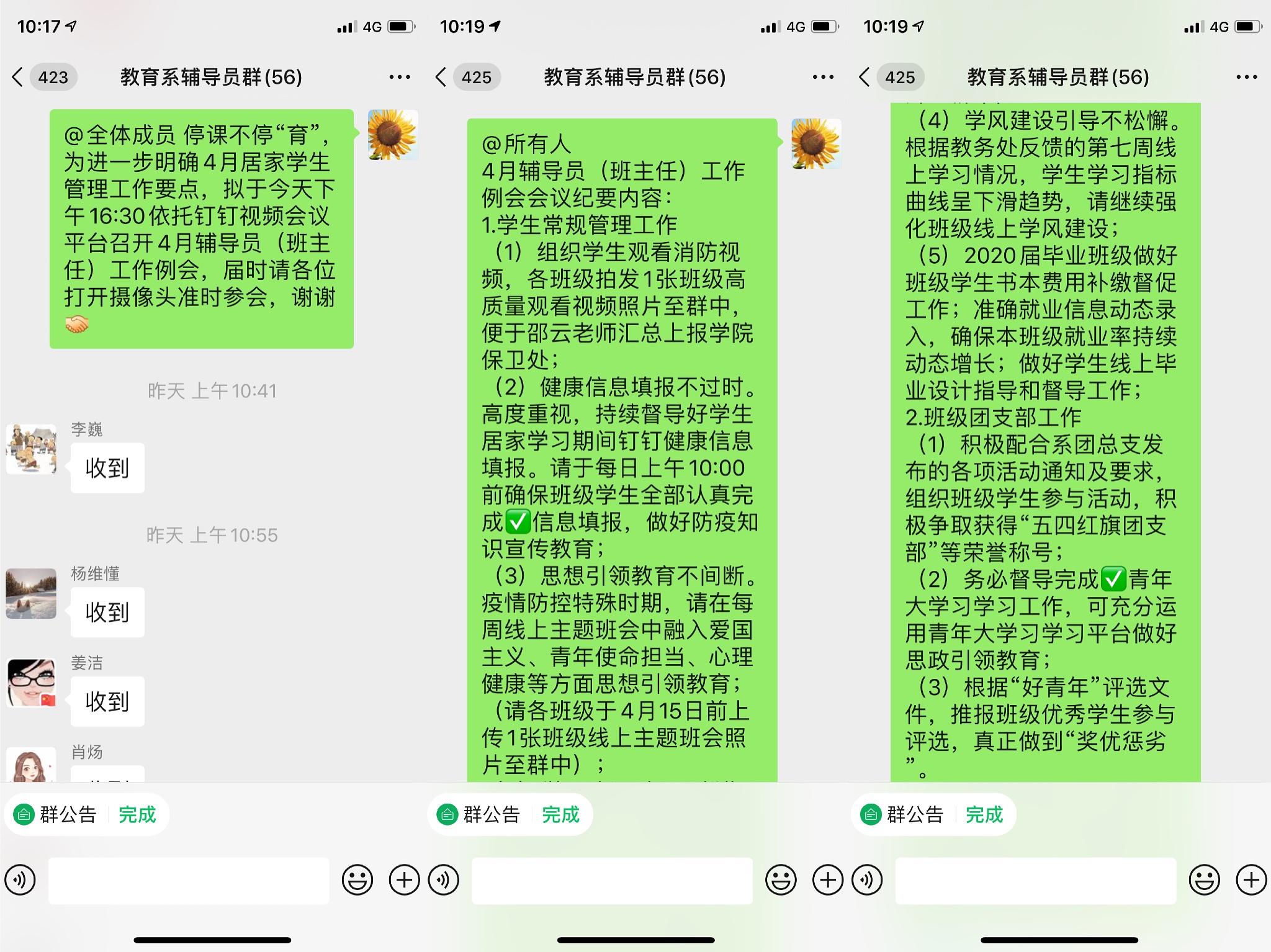 随后,徐立娟强调,疫情防控期间,辅导员(班主任)全程“宅家办公”,需做到停课不停“育”,全程育人“在线”。一要,思想引领不间断,疫情防控特殊时期,每周线上主题班会中融入爱国主义、青年使命担当、心理健康等方面思想引领教育;二要,学风建设不松懈,充分利用线上学习的优势,强化班级线上学风建设;三要,疫情防控不放松,以“安全健康第一”的观念,高度重视学生的健康信息打卡,及时反馈学生居家健康情况,同时做好疫情知识宣传教育;四要,班级团建不忽视,以支部建设和班级建设激活班级活力,让学生“动”起来,引导学生充分利用青年大学习平台做好思想引领教育。
