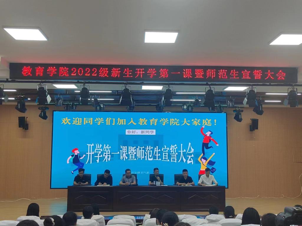 新的学期,开启新的希望;新的征程,承载新的梦想。9月18日,教育学院在学院报告厅举行2022级新生“开学第一课”暨师范生宣誓大会。教育学院党总支书记钱庆兵,校党委委员、教育学院院长高国柱,教育学院副院长刘明辉,学管秘书杨维懂,团总支书记黄正顺出席活动,新生辅导员(班主任)以及2022级新生40名代表参加线下仪式。受疫情影响,其他新生在各自班级以直播的方式同步参加了本次仪式。仪式由教育学院陈立超老师主持。