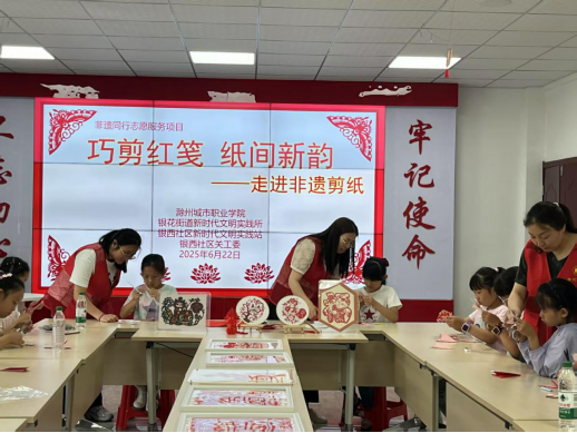 为传承非遗文化,丰富辖区未成年人课余生活,6 月 22 日,我院走进南谯区银花街道银西社区,举办了一场别开生面的“巧剪红笺 纸间新韵” 非遗剪纸进社区主题活动,为辖区未成年人的课余生活增添了一抹绚丽的文化色彩。