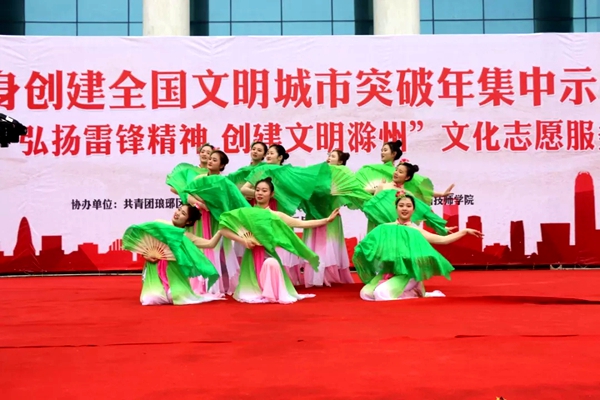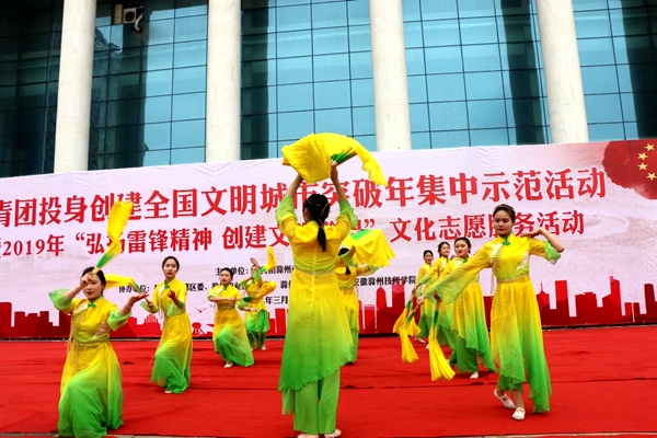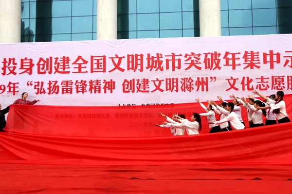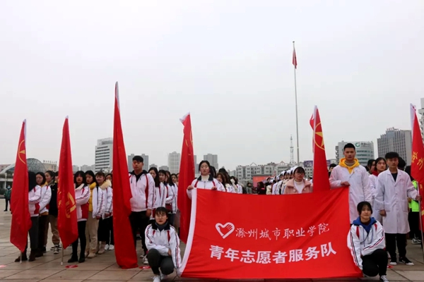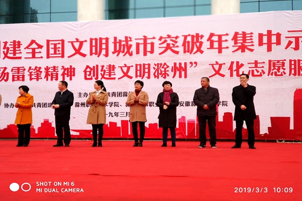 为进一步弘扬雷锋精神,推动青年志愿活动的深入开展,认真践行社会主义核心价值观,传递社会正能量,3月3日上午,我院200余名青年志愿者清晨七点出发,早早来到了滁州市人民广场,参加了共青团滁州市委主办的2019年“弘扬雷锋精神 创建文明滁州”青年志愿集中集中示范活动,院领导施向阳,团委书记周慧参加了本次活动。