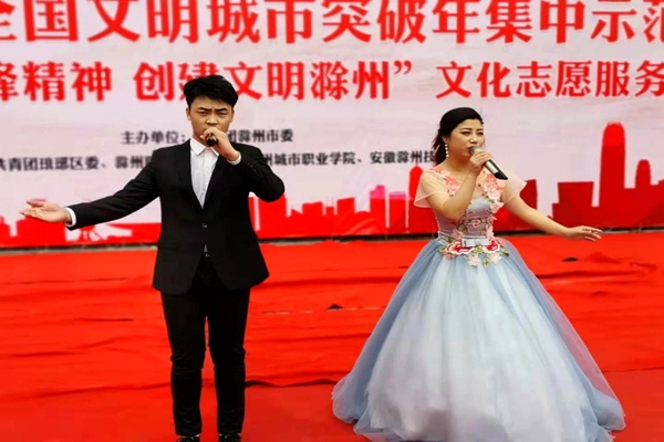 在随后开展的文艺志愿服务活动中,我院志愿者给大家带来了精彩的表演,《凤阳花鼓》点燃了全场的气氛;现代舞《师魂》再现了人民教师的高大形象,催人泪下;快板《雷锋谣》节奏明快,韵律十足歌颂了雷锋同志高尚的品质;古典舞《出水莲》和《稻花吟》美轮美奂,将演出推向高潮,赢得现场观众的阵阵掌声;歌曲联唱《中国之路》展现了时代的变迁,演出在同学们悠扬的歌声中完美落幕。