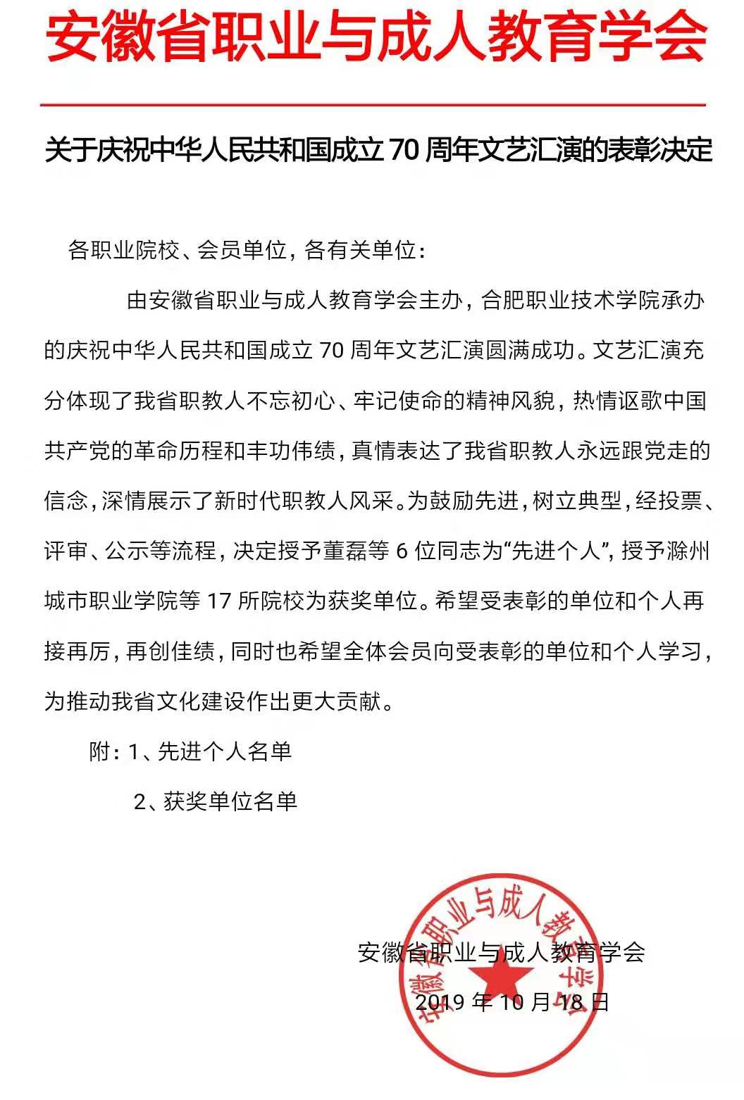 本次“庆祝中华人民共和国成立70周年文艺汇演”活动由安徽省职业与成人教育学会主办,于9月27日在合肥职业技术学院隆重举行。活动旨在充分体现我省职教人不忘初心、牢记使命的精神风貌,热情讴歌中国共产党的革命历程和丰功伟绩,真情表达了我省职教人永远跟党走的信念,深情展示了新时代职教人风采。