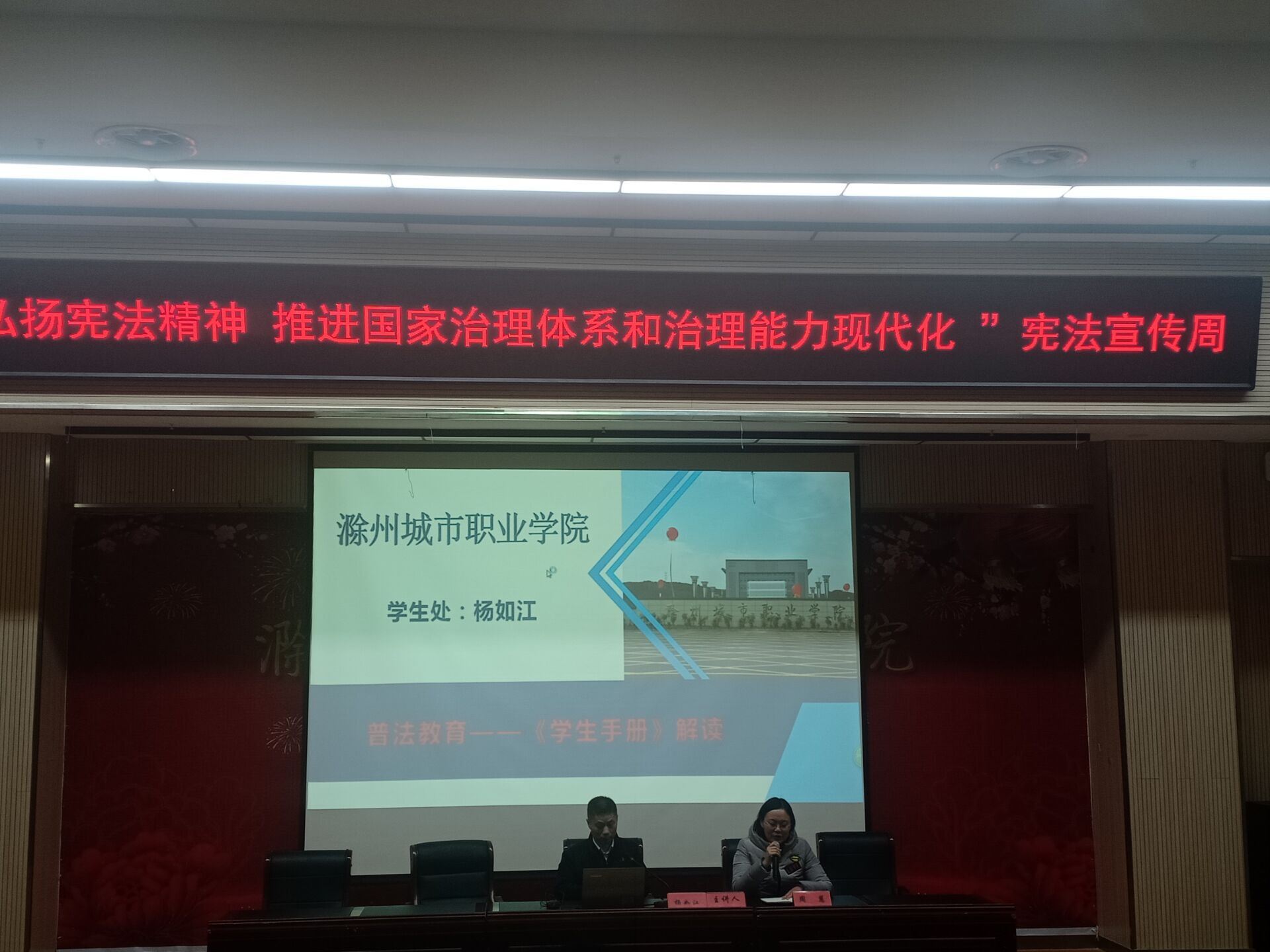 为宣传宪法知识和法治文化,增强大学生法律意识,提高大学生自我防范意识,12月4日下午,院团委于图文中心四楼报告厅组织开展了主题为“‘弘扬宪法精神,推进国家治理体系和治理能力现代化‘宪法宣传周”主题讲座。讲座由院学生处杨如江处长主讲,来自全院近300名师生全程聆听了本次讲座。