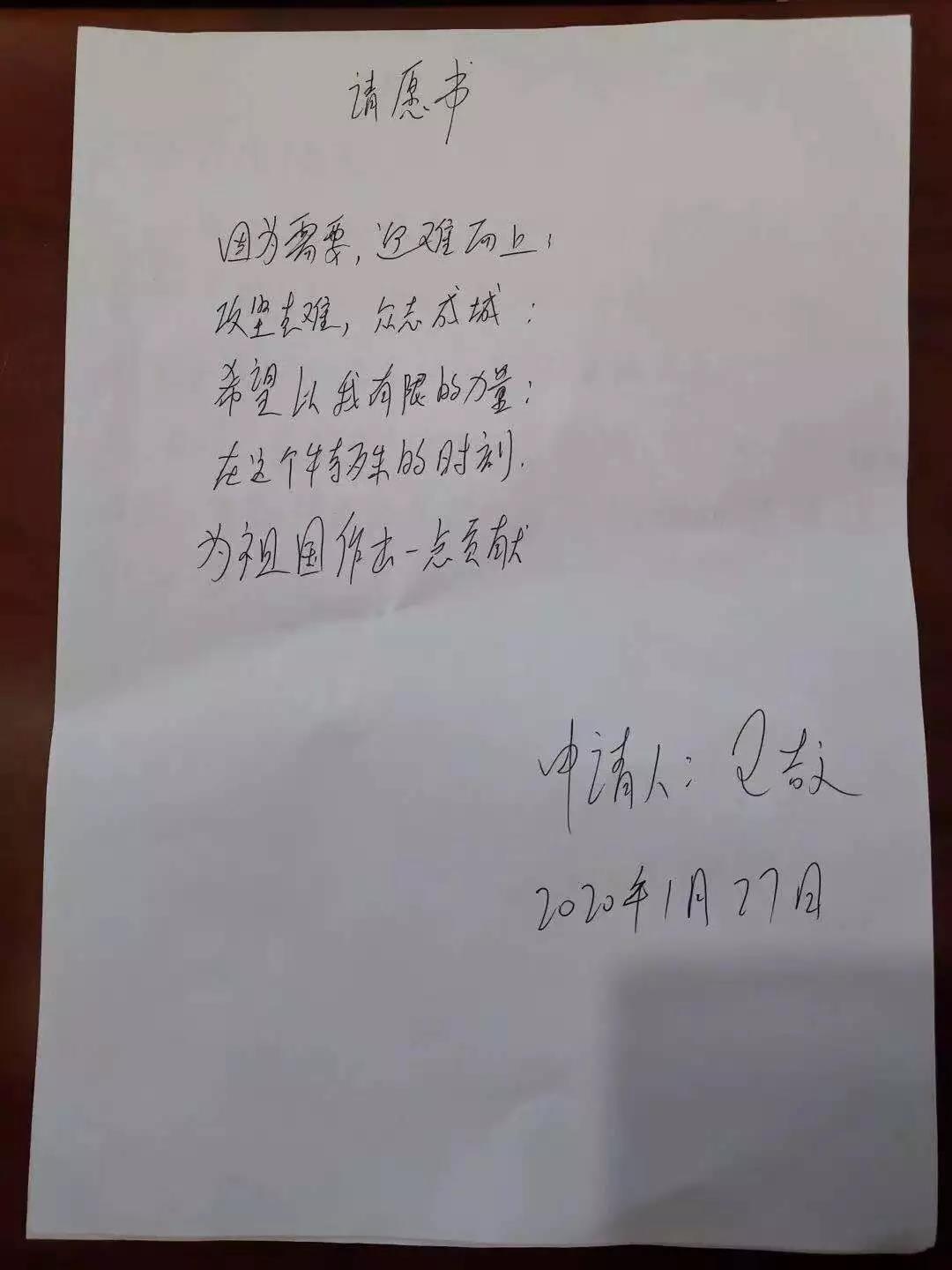 但是他没有退缩,更不会后悔。在申请加入本次驰援武汉的“请战书”上,他这样写道: