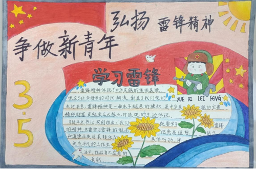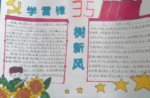 为进一步弘扬雷锋精神,丰富校园文化生活,我校积极组织学生设计、创作学习雷锋精神主题板报和手抄报。同学们把对雷锋的崇敬和怀念之情深深地融入作品里,以多样的角度展现雷锋的光辉形象,用独特的方式赞扬雷锋的钉子精神、歌颂雷锋全心全意为人民服务的高尚品质,激励着学生用自己的实际行动践行雷锋精神,努力成为新时代雷锋精神的传播者、弘扬者和践行者。