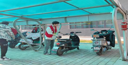 为消除校园内交通安全隐患,志愿者还积极开展文明交通活动,对教学楼、宿舍楼下的单车、电动车进行整理摆放,同时对于校园内超速行驶等不文明交通现象进行劝导。