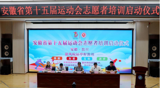 6月15日下午三点,安徽省第十五届运动会志愿者培训启动仪式在我校图文中心四楼报告厅隆重举行。我校党委委员、副校长吴惠珍,团滁州市委副书记万小宇,滁州学院教育科学学院团委书记聂辉,滁州职业技术学院团委朱芡芡等人出席启动仪式,我校各学院团总支书记携130名志愿者参加仪式。