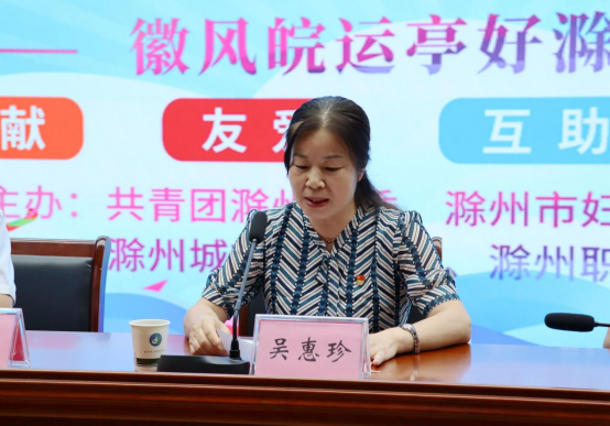 吴惠珍发表讲话,她强调,广大青年志愿者们要树立服务意识,加强理论学习与团结协作精神,争做传递文明、传播美德的使者,做滁州形象、滁州精神的展示者,用优秀的服务传递滁州文明,用饱满的热情、精湛的技能为各地选手和嘉宾提供全面、周到、细致的志愿服务,更好的展现出滁州学子的精气神。
