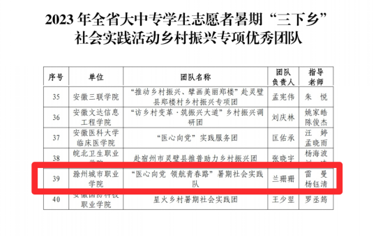 近日,2023年安徽省大中专学生志愿者暑期“三下乡”社会实践活动评选结果公布,我校荣获2023年全省暑期“三下乡”社会实践活动“优秀组织单位”,2篇调研报告获得三等奖,分别是葛子正老师指导的《建设宜居宜业和美乡村背景下安徽滁州乡村“双碳”开展现状的调查》和朱容倩老师指导的《关于内蒙古兴安盟科尔沁右翼中旗普通话普及情况的调查研究》,医学院“医心向党 领航青春路”暑期社会实践队获得乡村振兴专项优秀团队。