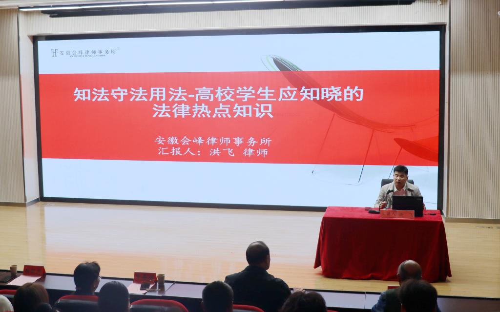 为进一步增强我校学生的法律意识和法治观念,加强法治安全教育,10月17日下午,学校联合滁州市政协关工委开展了普法知识讲座。校党委书记牛春雨,市政协关工委主任胡新忠,市政协关工委副主任李锡富、刘萍、张先礼,校关工委副主任汪勇出席活动。活动邀请滁州市法律界优秀青年律师、安徽会峰律师事务所合伙人洪飞进行主讲,活动由团委书记陈婷婷主持,来自各学院200余名青年大学生聆听讲座。
