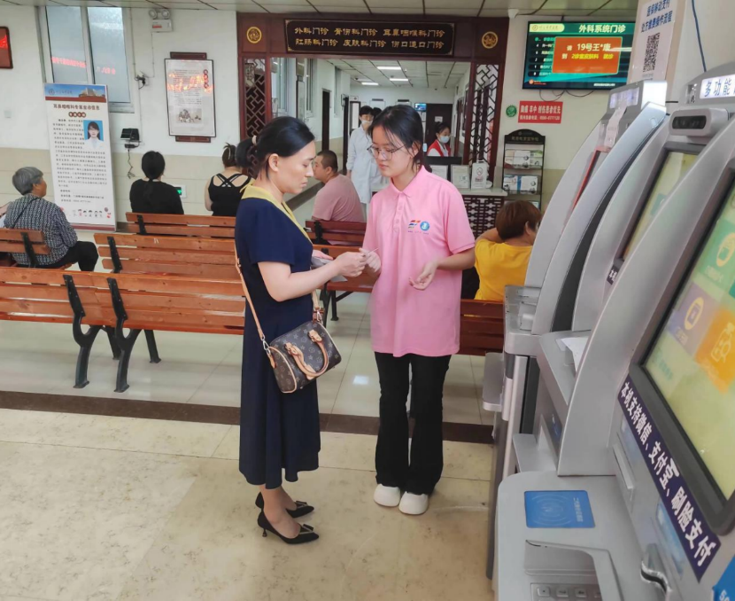 志愿者们被分配到明光市中医院的不同区域,包括门诊大厅、挂号处、各科室候诊区等关键位置。她们身着统一的志愿者服装,以饱满的热情投入到导医工作中。