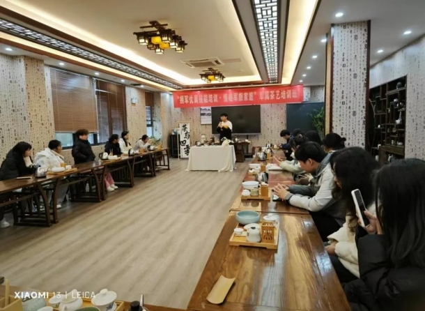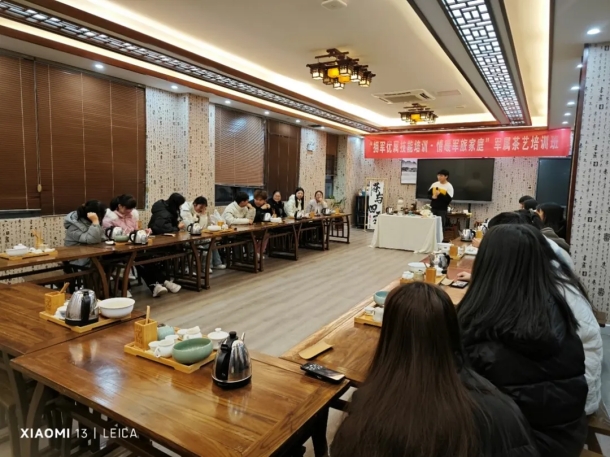 12 月 6 日下午 ,清韵茶艺社在茶艺实训室以大雪节气为契机,举办了一场大雪茶会活动。此次活动旨在汇聚社团成员,共同领略茶艺之美、品味茶韵悠长、感悟茶道精神,传承中华茶文化。活动伊始,副社长带领社员们系统复习了此前活动中所学的茶艺知识与技能,从茶具的精心布置,到每一杯茶的冲泡方式,社员们在实践中重温茶艺的精妙,感受着大雪时节茶所传递的独特温暖与惬意,整个茶艺室茶香四溢,气氛热烈而融洽。