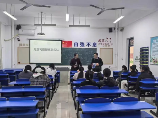 活动开场,急救队指导老师陈凯老师和胡仁宜老师分别引用真实案例开展教学,同时,为强化教学效果,两位老师现场模拟气道梗阻场景,分步演示急救手法。陈凯老师强调,海姆立克急救法主要是通过快速向上冲击患者上腹部,利用肺部残留气体形成气流冲出异物,黄金施救时间仅4 - 6分钟,施救者需单膝跪地,将婴儿面部朝下放置于大腿,用手掌根部连续拍击肩胛骨区。社团成员纷纷表示:“以前遇到这种情况只会打120,现在掌握了这项技能,关键时刻能真正发挥作用!”