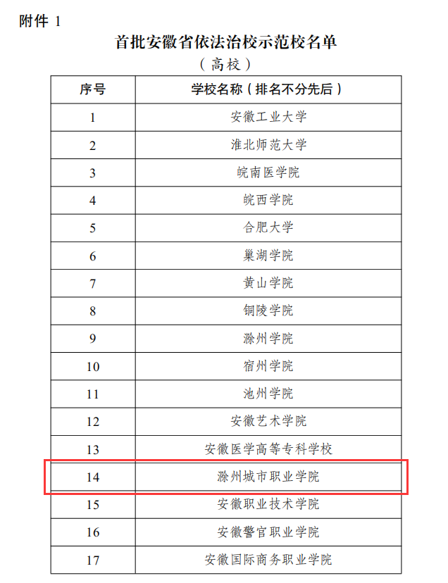 近日,安徽省教育厅正式发布《安徽省教育厅关于公布首批安徽省依法治校示范校名单的通知》(皖教秘政法〔2024〕30号),在各地各校积极创建和申报的基础上,经专家评审、集体评议和结果公示,认定17所高校、18所中小学校为第一批全省依法治校示范校,最终我校成功入选!热烈祝贺!