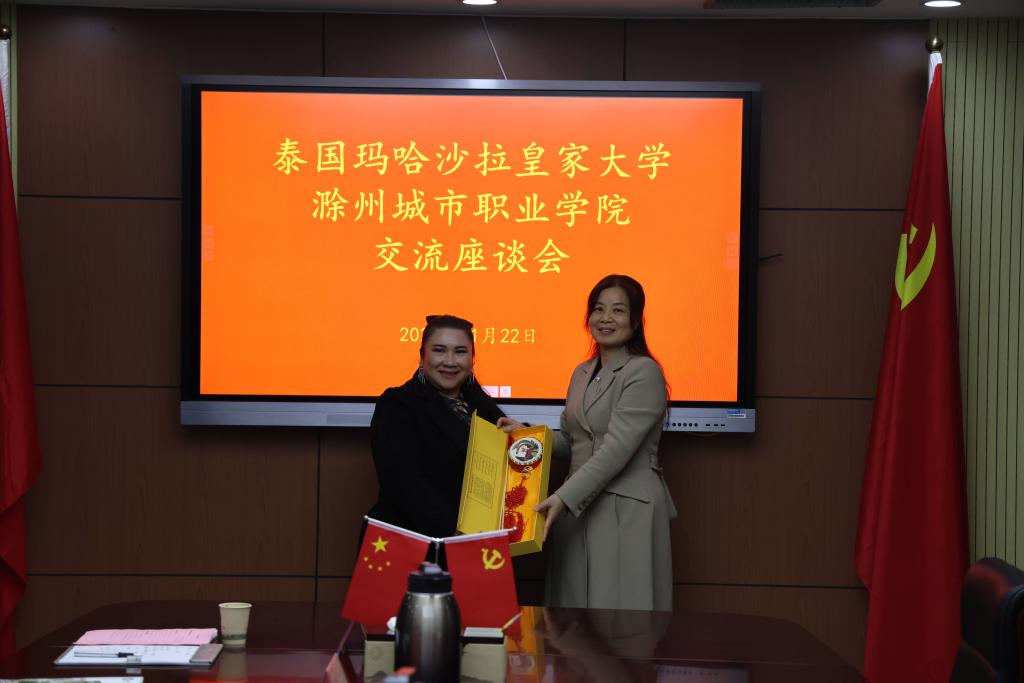 吴惠珍代表学校向Dr.Ratchanida Saiyaros、Dr.Chuthathip Pholyiam女士赠送国家级非物质文化遗产——凤阳花鼓,并希望双方强国际办学合作,建立友好交流关系。