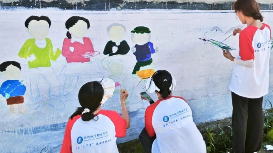(图为志愿者进行乡村振兴墙绘制作)