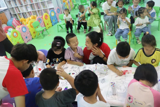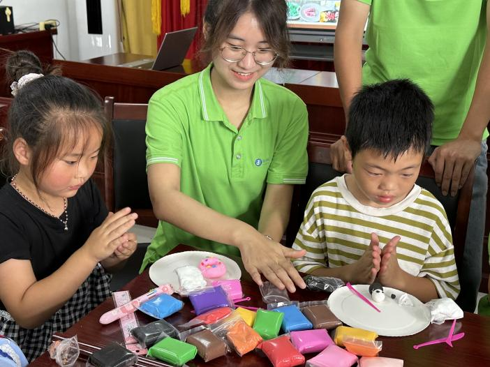 (图为志愿者与小朋友一起创作手工作品)