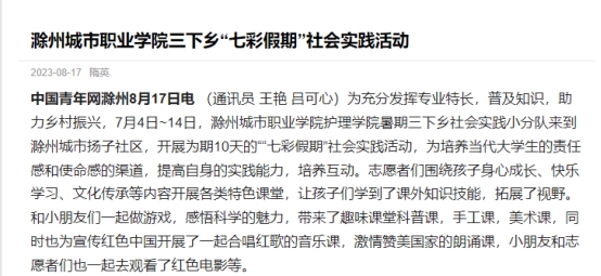 各实践团积极利用学习强国、安徽日报、安徽省教育厅宣传网站、安徽学联、中青校园网、安青网等省级、国家级平台积极宣传志愿活动,共计宣传报道60余篇,累计点击浏览超2万余人次。同时,计划在2023 年秋季学期开学季举办社会实践成果展示,注重挖掘社会实践先进典型,提炼有特色的实践育人机制、思路、模式,为建设教育强国营造良好氛围。