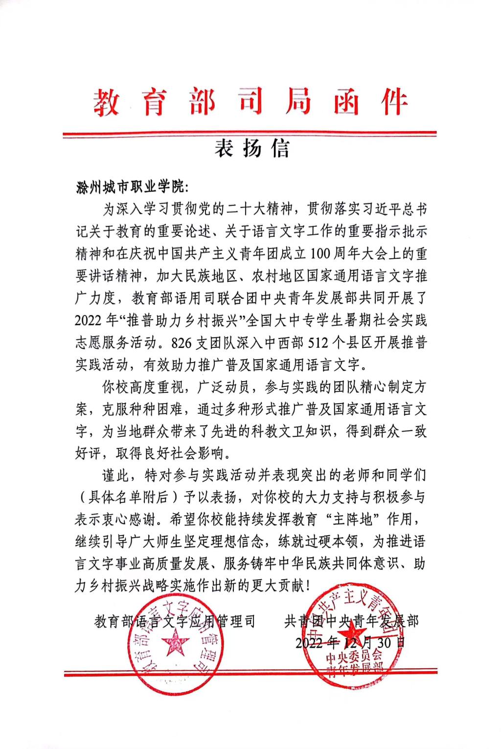 近日,教育部语言文字应用管理司、共青团中央青年发展部向我校寄来表扬信,表扬我校参与2022年“推普助力乡村振兴”全国大学生社会实践志愿服务活动的师生,由医学院张少敏、苏日娜老师指导,陈依琳、陈婉玉、盛煜、王天然、王晨晨、徐心怡、周乐、单梦雅、沈淑瑶等同学组成的推普助力乡村振兴实践队被评为优秀团队。热烈祝贺!