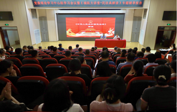 为深入学习贯彻习近平法治思想,扎实做好第四个“民法典宣传月”活动,5月31日下午,学校党委理论学习中心组(扩大)学习会暨《城院大讲堂•民法典解读》专题辅导报告会在图文中心四楼报告厅举行。市委党校法学教研室主任、市委宣讲团成员丁德恒副教授应邀作民法典知识解读。校党委理论学习中心组成员汪上、牛春雨、曹士东、吴惠珍、池鹏、陈通、杨如江、高国柱出席报告会。报告会由党委委员、副校长曹士东主持。