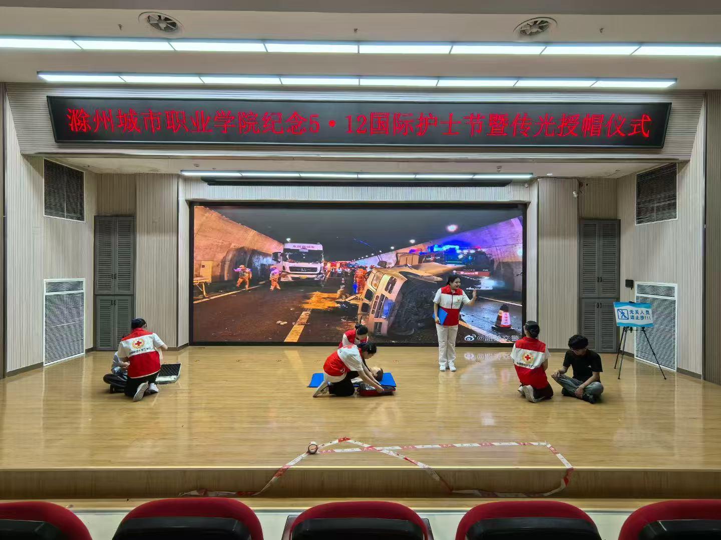 在表演环节,护生们带来的创意手语舞《如愿》将音乐、舞蹈与护理工作场景巧妙融合,她们用灵动的双手、优美的舞姿,传递出对护理事业的无限热爱,展现出青春活力与积极向上的精神风貌。在模拟车祸场景的《急救技能展示》节目中,护生们精心还原急救时紧张的工作氛围,通过紧张刺激的急救演练,展示出扎实的急救技能和临危不乱的专业素养。从快速准确的病情判断,到有条不紊地实施心肺复苏、包扎止血等操作,每一个动作都规范标准,彰显了他们在专业学习中的努力与收获。