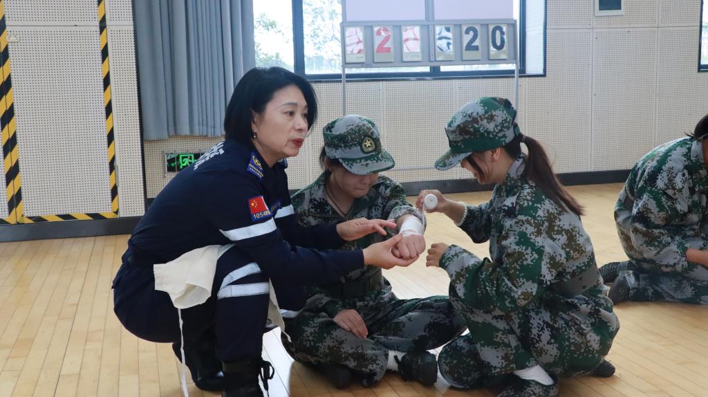 滁州市1054救援协会的朱修利、严玲讲解并演示如何快速止血、包扎,并利用身边日常物品进行应急处理。
